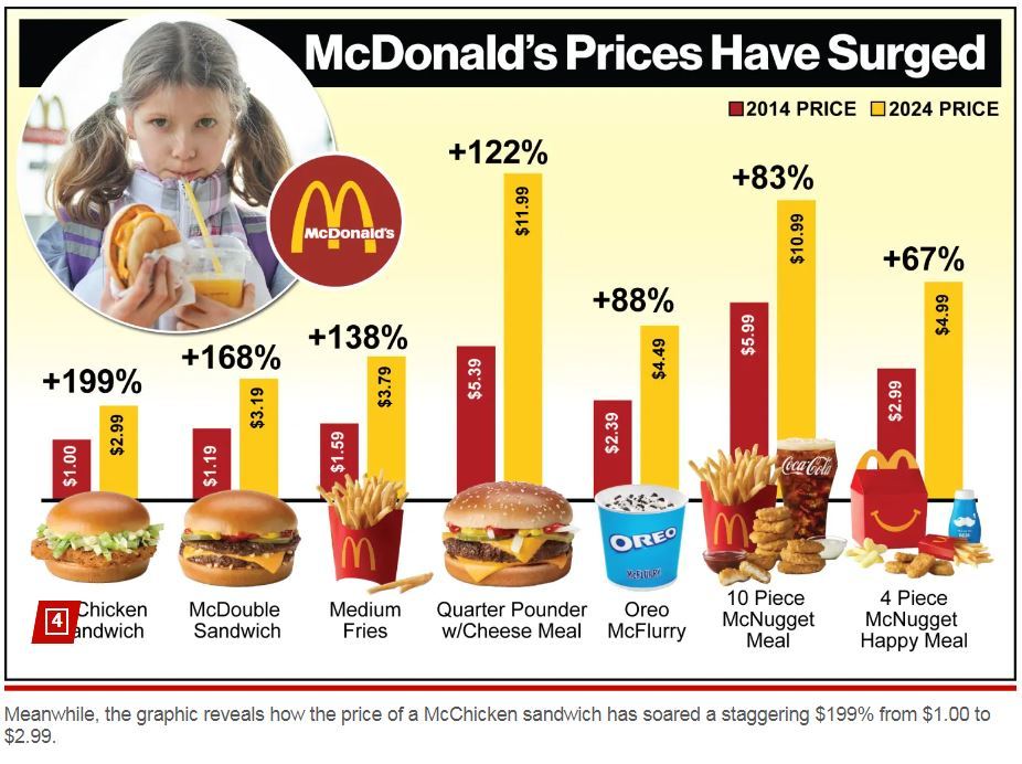以麥當(dāng)勞經(jīng)典單品雙吉漢堡為例,2014年的平均價(jià)格為1.19美元,現(xiàn)在卻賣(mài)到3.19美元,漲價(jià)幅度高達(dá)168%。