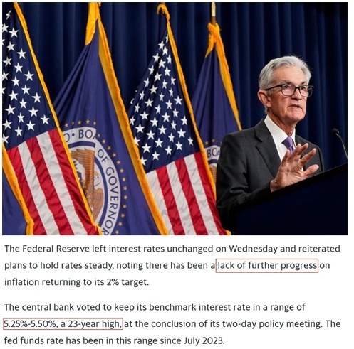 在本月初結(jié)束最新一次議息會(huì)議后,美聯(lián)儲(chǔ)決定繼續(xù)將聯(lián)邦基金利率維持在5.25%-5.0%的目標(biāo)區(qū)間,理由是在實(shí)現(xiàn)通脹目標(biāo)方面“缺乏進(jìn)一步進(jìn)展”。