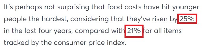 事實(shí)上,“食品通脹率”已經(jīng)超過(guò)了整體通脹率:過(guò)去四年,食品價(jià)格上漲了25%,而所有商品的價(jià)格平均漲幅為21%。