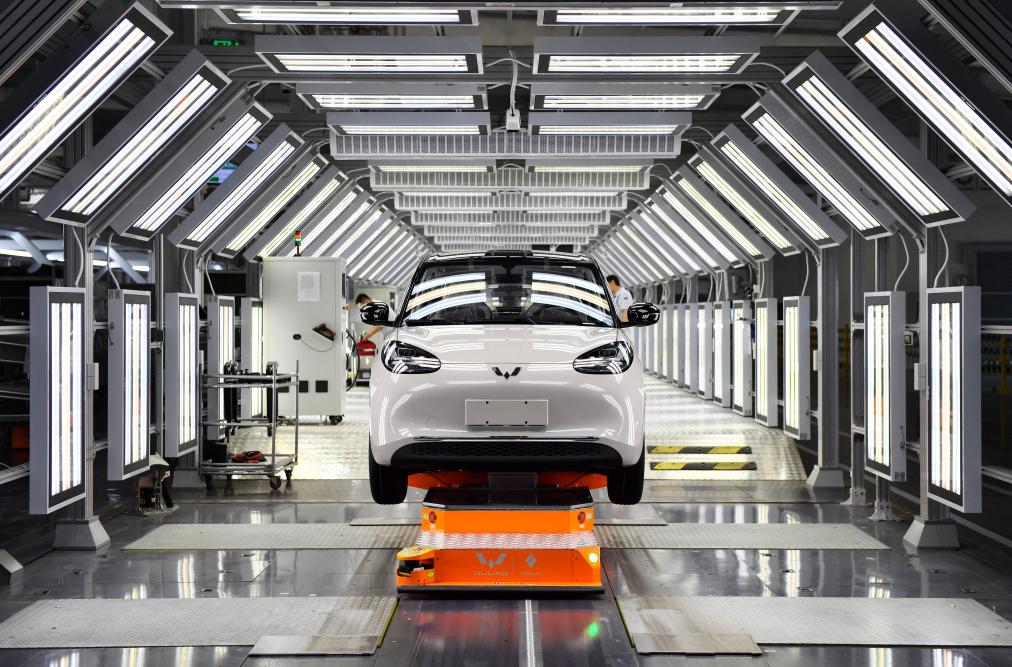 在廣西柳州市上汽通用五菱精益智造工廠拍攝的等待下線的整車(5月9日攝)。新華社記者金皓原攝