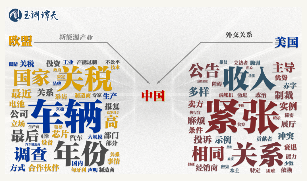可以看到,以“車輛”“部門”“公司”“制造”等詞為代表的關(guān)鍵詞,都指向了新能源行業(yè)。相比之下,美國媒體對(duì)同一話題的討論,更側(cè)重“緊張”“關(guān)系”“沖突”“政治”等指向外交關(guān)系的關(guān)鍵詞。