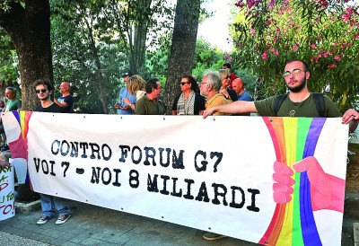 6月14日,在意大利法薩諾,抗議者打出“你們只有七個,我們是八十億人”的標(biāo)語,批評七國集團與世界完全割裂。新華社記者 李京攝