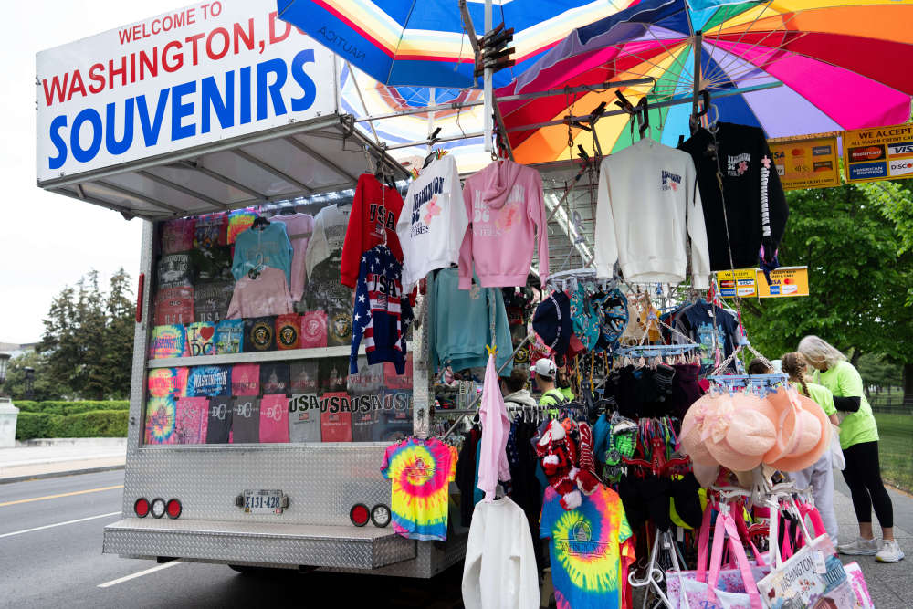 4月25日,在美國首都華盛頓,游客在一處白宮附近的紀(jì)念品攤位前選購商品。新華社記者劉杰攝
