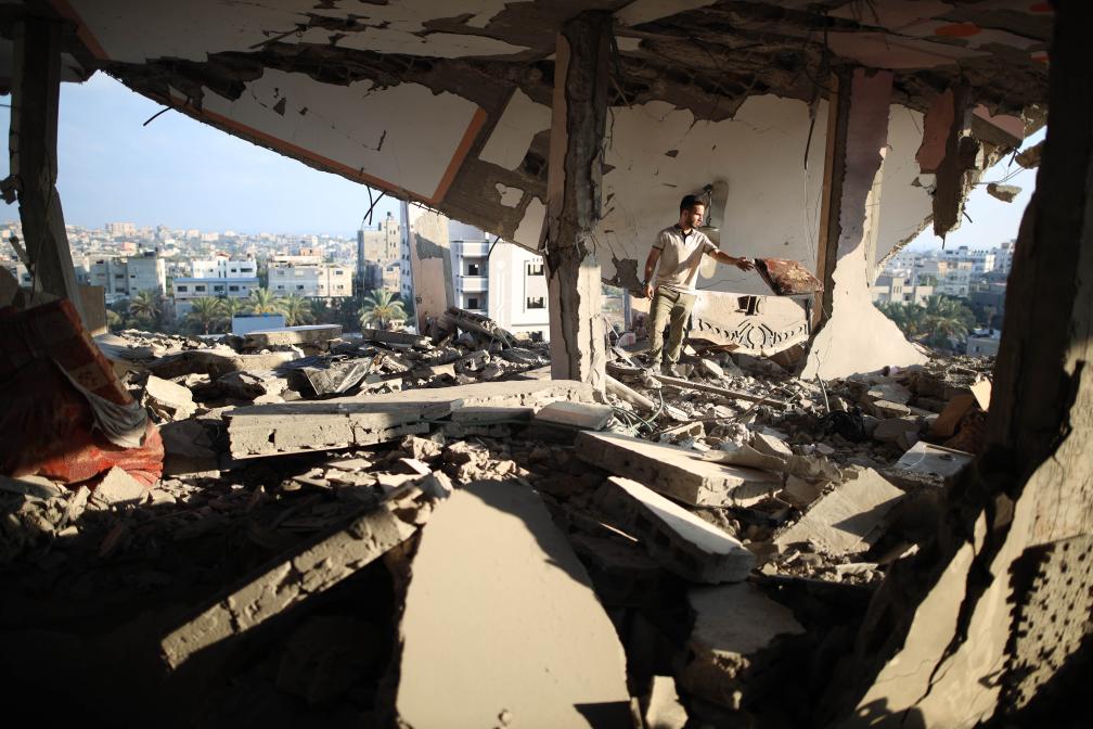 7月18日,在加沙地帶中部努賽賴特難民營,一名男子查看遭到以軍襲擊的建筑廢墟。新華社發(fā)(馬爾萬·達(dá)烏德攝)