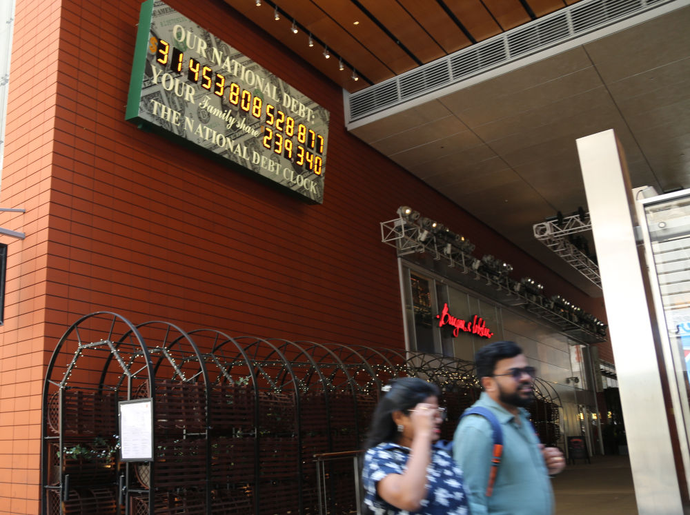 2023年5月29日,人們經(jīng)過美國紐約曼哈頓的“國債鐘”?!皣鴤姟笔且粋€大型計數(shù)器,它實時更新美國的公共債務(wù)總額,并顯示出每個美國家庭所要負(fù)擔(dān)的數(shù)額。新華社記者劉亞南攝