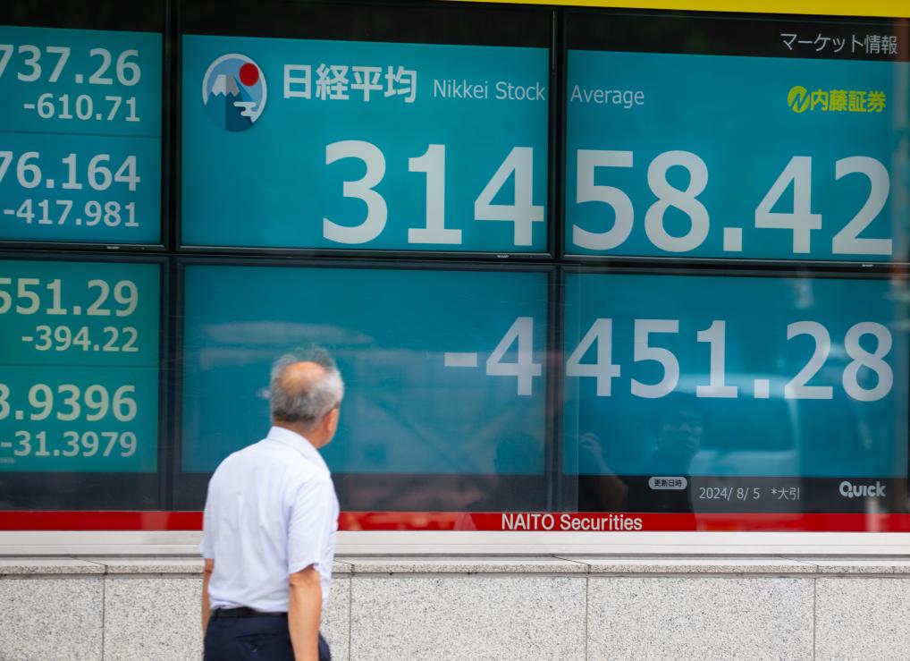 8月5日,行人走過位于日本東京的顯示實時股價的電子屏幕。新華社記者岳晨星攝