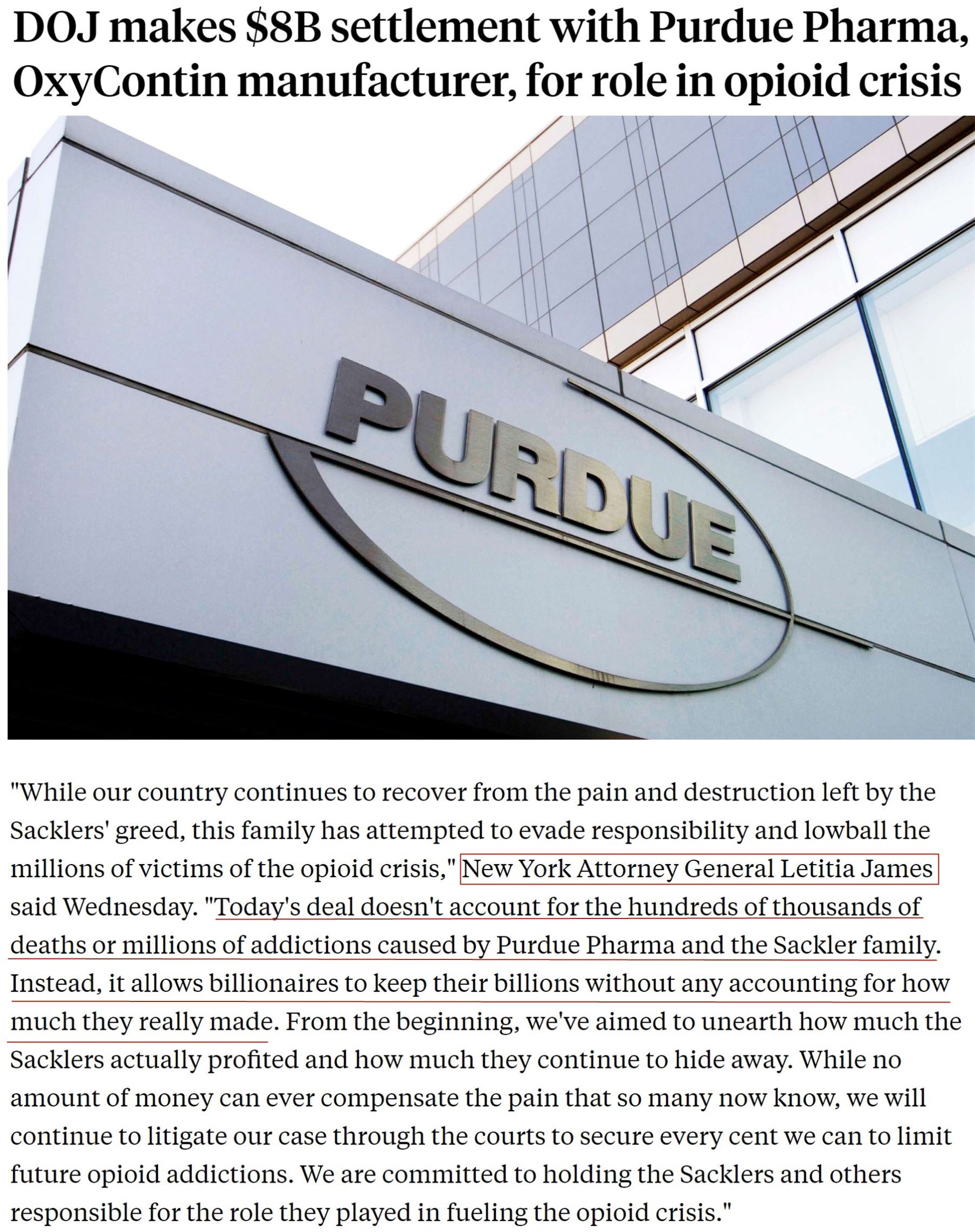 但紐約州總檢察長(zhǎng)利蒂希婭·詹姆斯發(fā)表聲明,批評(píng)司法部與普渡制藥公司達(dá)成的和解協(xié)議,表示“協(xié)議不能解決普渡制藥公司和薩克勒家族造成的數(shù)十萬(wàn)人死亡以及數(shù)百萬(wàn)人成癮的現(xiàn)實(shí)。相反,和解協(xié)議使億萬(wàn)富翁可以保留其數(shù)十億美元的資產(chǎn)而無需為他們實(shí)際造成的傷害付出代價(jià)?!?/p>