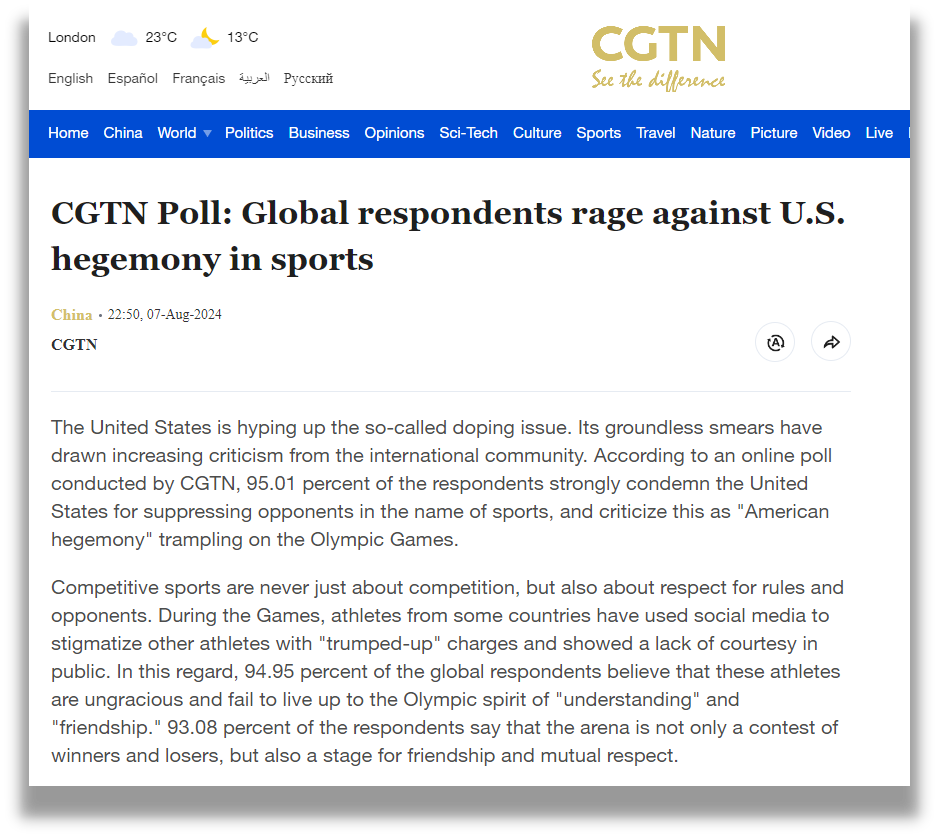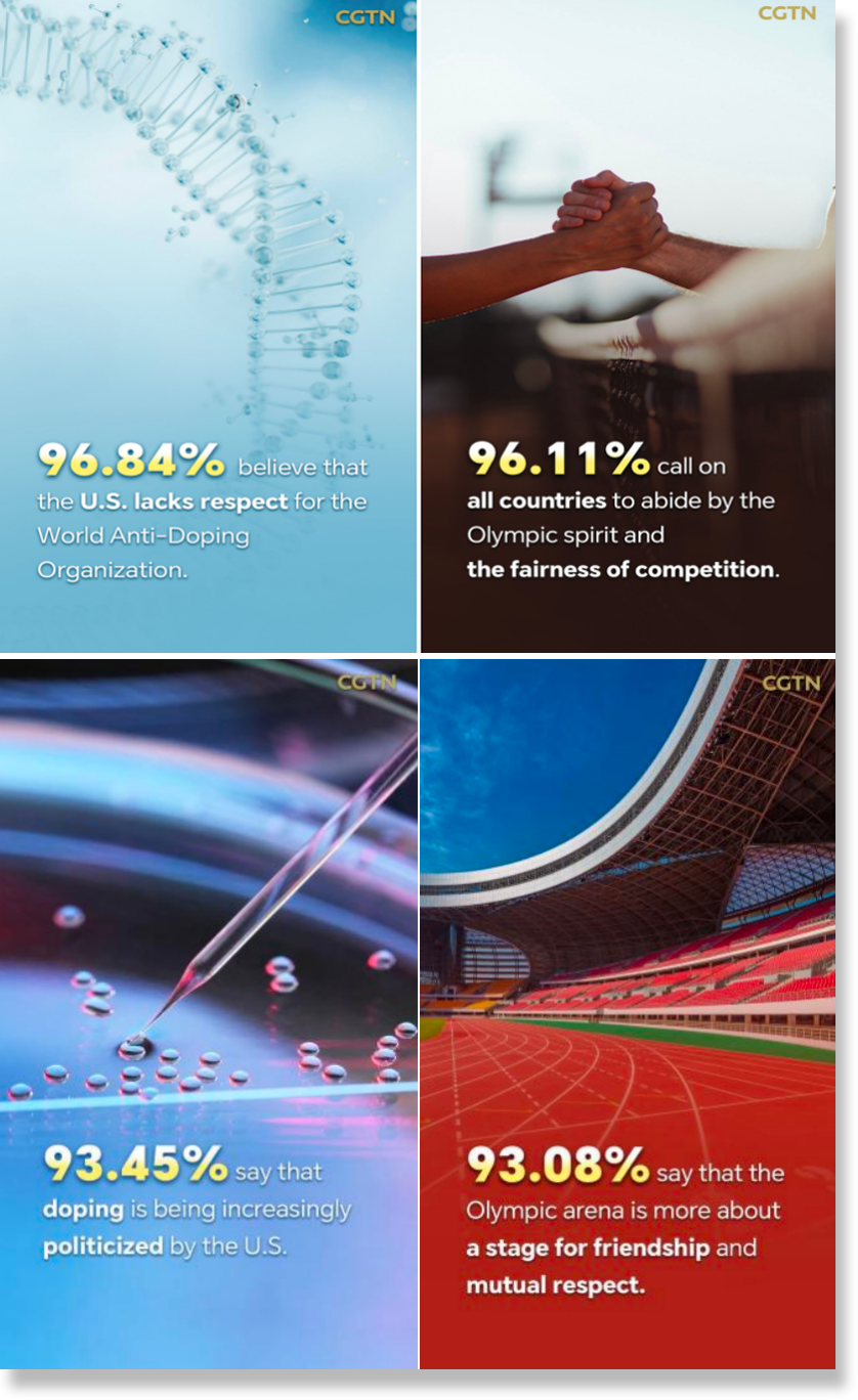 總臺(tái)CGTN先后兩次發(fā)起全球民調(diào),調(diào)查顯示,96.84%的受訪者認(rèn)為美方缺乏對(duì)世界反興奮劑機(jī)構(gòu)的尊重,是在挑戰(zhàn)公平和權(quán)威;96.25%的受訪者痛批美國(guó)在興奮劑監(jiān)管方面“雙重標(biāo)準(zhǔn)”;93.45%的受訪者表示,興奮劑問(wèn)題日益被美國(guó)政治化和工具化;95.57%的受訪者認(rèn)為美國(guó)反興奮劑機(jī)構(gòu)或存包庇行為,為涉興奮劑的美國(guó)運(yùn)動(dòng)員開(kāi)脫……