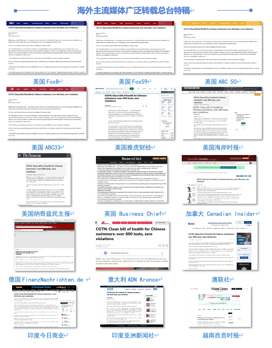 針對(duì)美西方借興奮劑抹黑中國(guó)這一議題,總臺(tái)多語(yǔ)種對(duì)外傳播平臺(tái)與海外總站、國(guó)際視頻通訊社緊密聯(lián)動(dòng),通過(guò)全球媒體伙伴網(wǎng)絡(luò),不斷放大正義的音量。僅在3天內(nèi),就有1800余家海外主流媒體積極轉(zhuǎn)載總臺(tái)多語(yǔ)種特稿,創(chuàng)下短時(shí)傳播新紀(jì)錄,引發(fā)國(guó)際輿論高度關(guān)注和強(qiáng)烈反響。