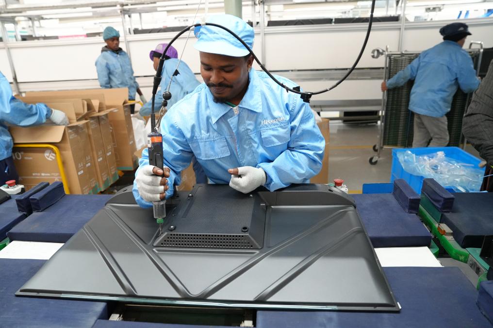 8月14日,在南非開普敦,當?shù)貑T工在海信南非工業(yè)園的電視機生產(chǎn)線上工作。新華社記者王雷攝