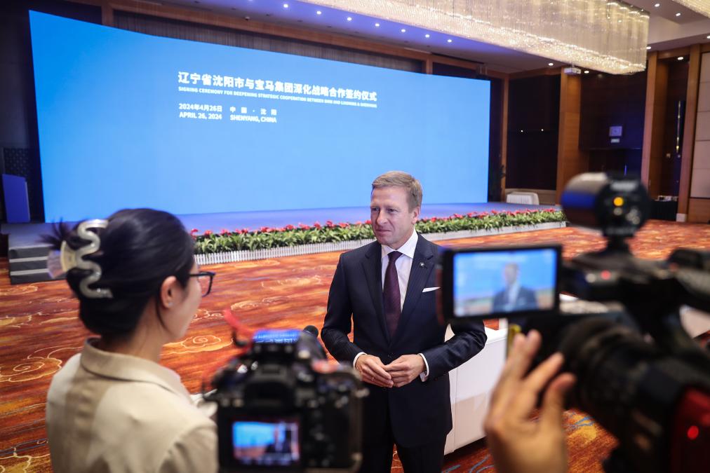 2024年4月26日,寶馬集團(tuán)董事長(zhǎng)齊普策在遼寧省沈陽(yáng)市與寶馬集團(tuán)深化戰(zhàn)略合作簽約儀式現(xiàn)場(chǎng)接受采訪。新華社記者潘昱龍攝