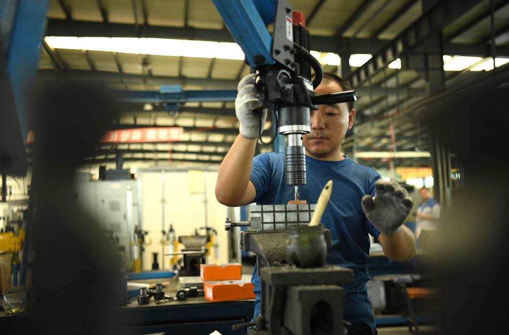2024年7月30日,在長(zhǎng)春吉林通用機(jī)械(集團(tuán))有限責(zé)任公司模具裝配生產(chǎn)線,鉗工在進(jìn)行攻絲操作。近年來(lái),吉林通用機(jī)械(集團(tuán))有限責(zé)任公司通過(guò)數(shù)字化改造、智能化升級(jí)提高生產(chǎn)效率,提升產(chǎn)業(yè)競(jìng)爭(zhēng)力,已成為全球鋁加工汽車輕量化零部件知名供應(yīng)商,為奧迪、大眾、寶馬、奔馳、保時(shí)捷等多家品牌主機(jī)廠供應(yīng)零件。新華社記者柳文惠攝