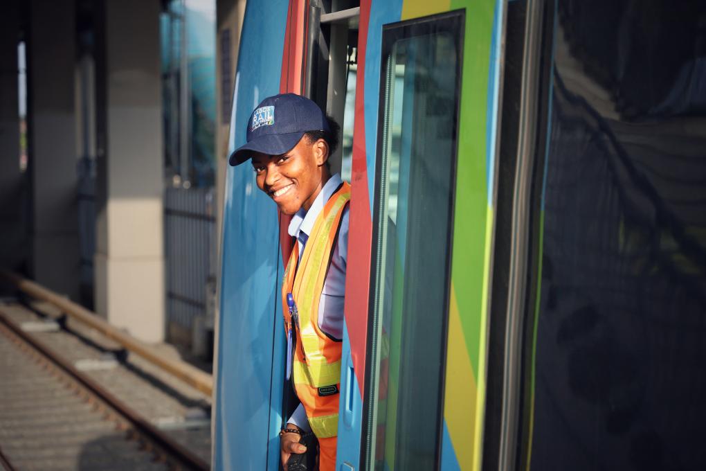 6月12日,在尼日利亞拉各斯,拉各斯輕軌藍(lán)線項目動車組列車司機(jī)組長伊莎貝拉·亞當(dāng)斯·伊斯拉埃爾與列車合影。新華社發(fā),中土集團(tuán)尼日利亞有限公司供圖