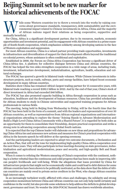 面對危機與挑戰(zhàn)增多、動蕩不安的當今世界,中國與非洲國家間展現的團結一致與強勁合作勢頭,不僅可以為世界注入更多確定性和信心,也可以為解決全球發(fā)展、治理和信任赤字提供方案。鑒于此,2024中非合作論壇峰會自然是全球矚目的焦點。