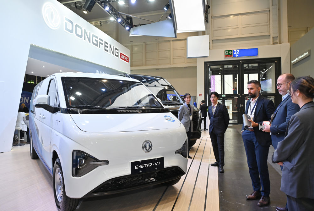 9月16日,在德國漢諾威國際交通運輸博覽會媒體預(yù)展上,人們在東風(fēng)汽車展區(qū)參觀E-STAR V7商用車。新華社記者任鵬飛攝