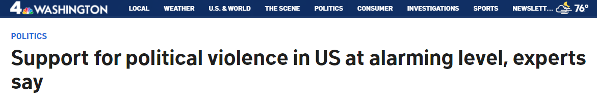 另外,美國國家廣播公司華盛頓地方頻道(NBC Washington)日前報道稱,盡管美國支持政治暴力的人與去年相比略有減少,但暴力支持者現(xiàn)在更傾向使用槍支來實現(xiàn)他們的目的。數(shù)月來,專家們始終表示,美國對出于政治動機的暴力的支持度達(dá)到了令人十分擔(dān)憂的水平。