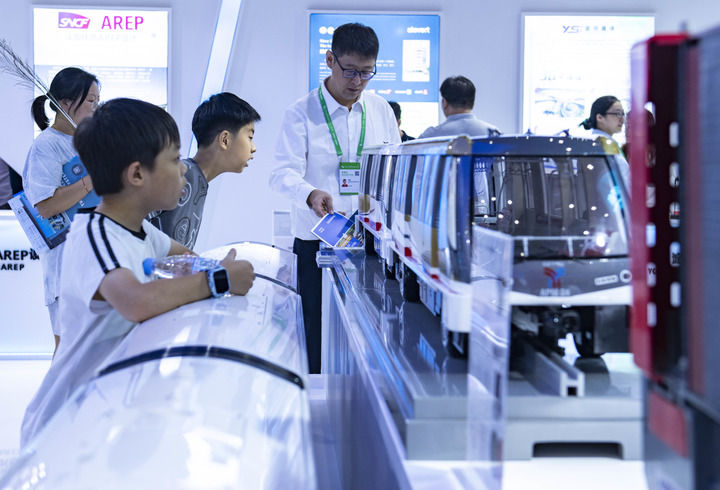 9月21日,小朋友在2024世界制造業(yè)大會上了解自動旅客捷運系統(tǒng)模型。新華社記者 傅天 攝