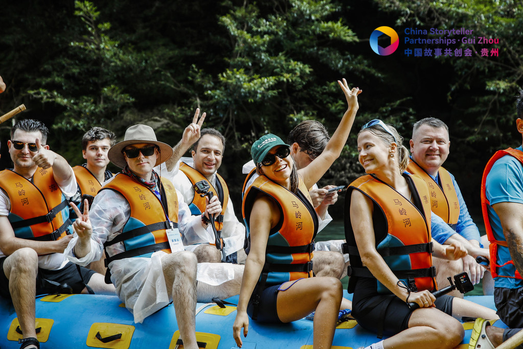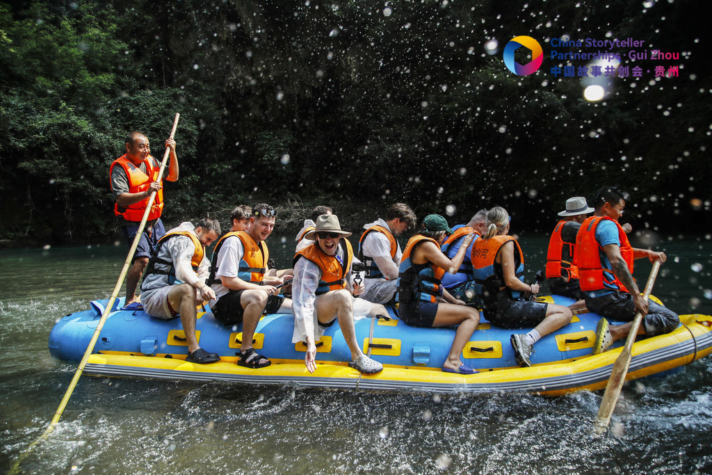 2024中國故事共創(chuàng)會“外籍網(wǎng)紅貴州行”采訪團(tuán)外籍成員在興義市馬嶺河峽谷體驗漂流。