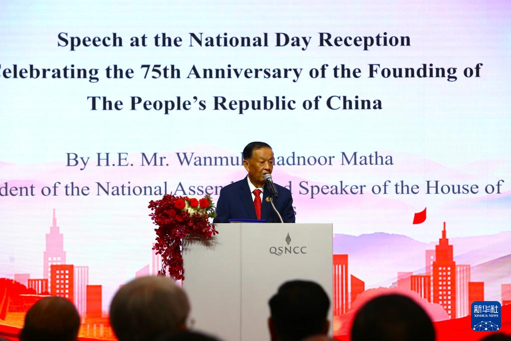 9月24日,在泰國(guó)曼谷,泰國(guó)國(guó)會(huì)主席兼下議長(zhǎng)萬(wàn)·穆罕默德·努爾·瑪他在中國(guó)駐泰國(guó)大使館國(guó)慶75周年招待會(huì)上致辭。新華社記者 孫瑋彤 攝