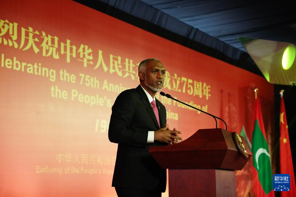 9月30日,馬爾代夫總統(tǒng)穆伊茲在馬累舉行的慶祝中華人民共和國(guó)成立75周年招待會(huì)上致辭。新華社記者 陳冬書(shū) 攝