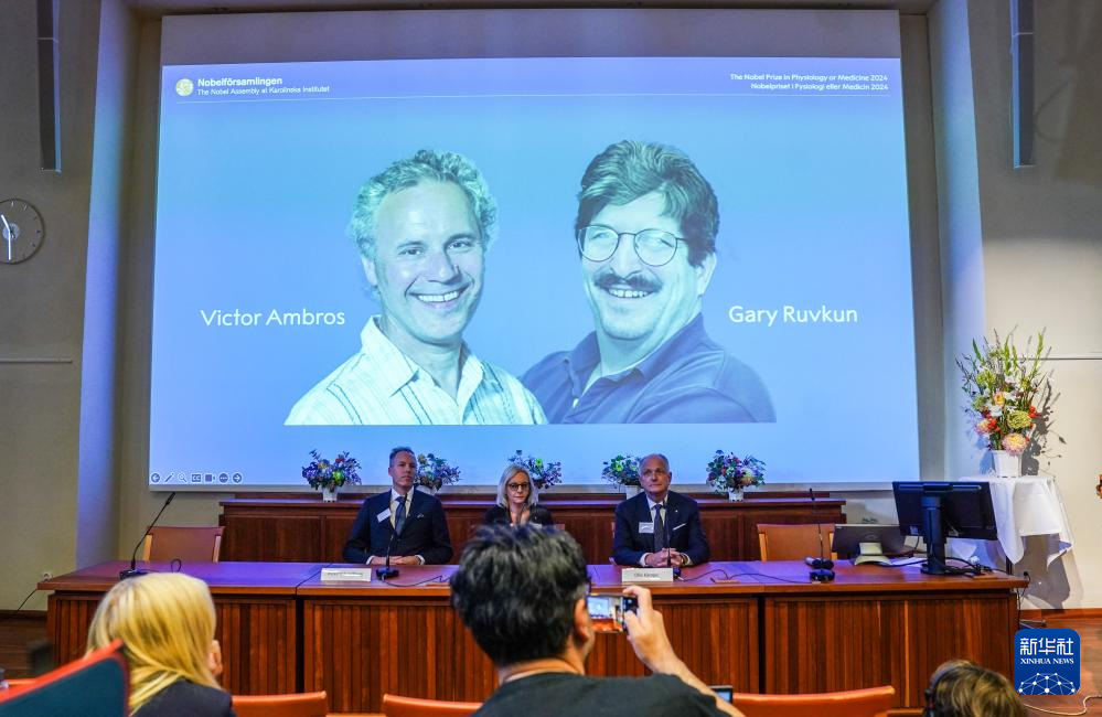 10月7日,在瑞典斯德哥爾摩舉行的2024年諾貝爾生理學(xué)或醫(yī)學(xué)獎(jiǎng)公布現(xiàn)場,屏幕顯示獎(jiǎng)項(xiàng)得主美國科學(xué)家維克托·安布羅斯(左)和加里·魯夫坎的照片。新華社記者 彭子洋 攝