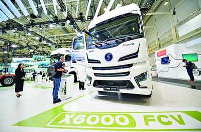 9月16日,在德國漢諾威國際交通運輸博覽會媒體預(yù)展上,參觀者在陜汽控股展區(qū)了解一款氫燃料電池牽引車。新華社發(fā)