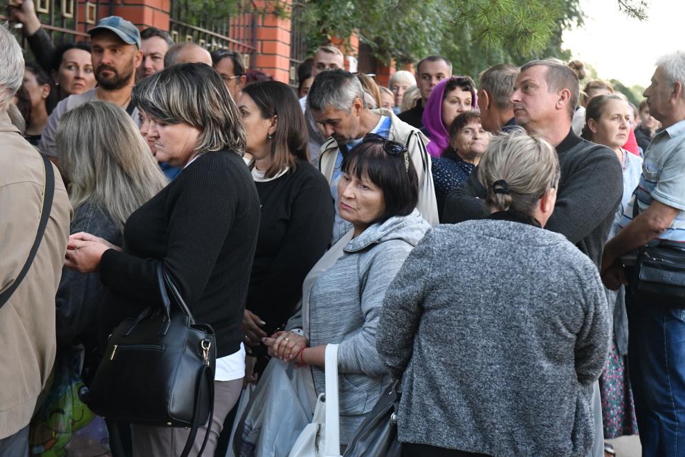 8月13日,在俄羅斯庫爾斯克市,來自俄烏邊境地區(qū)的居民排隊領(lǐng)取救援物資。新華社發(fā)