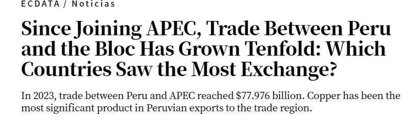 迄今為止,銅一直是秘魯向APEC成員出口的最重要產(chǎn)品。2023年,在442.48億美元的出口總額中,銅的出口總額為181.48億美元,黃金以33.70億美元位居第二。
