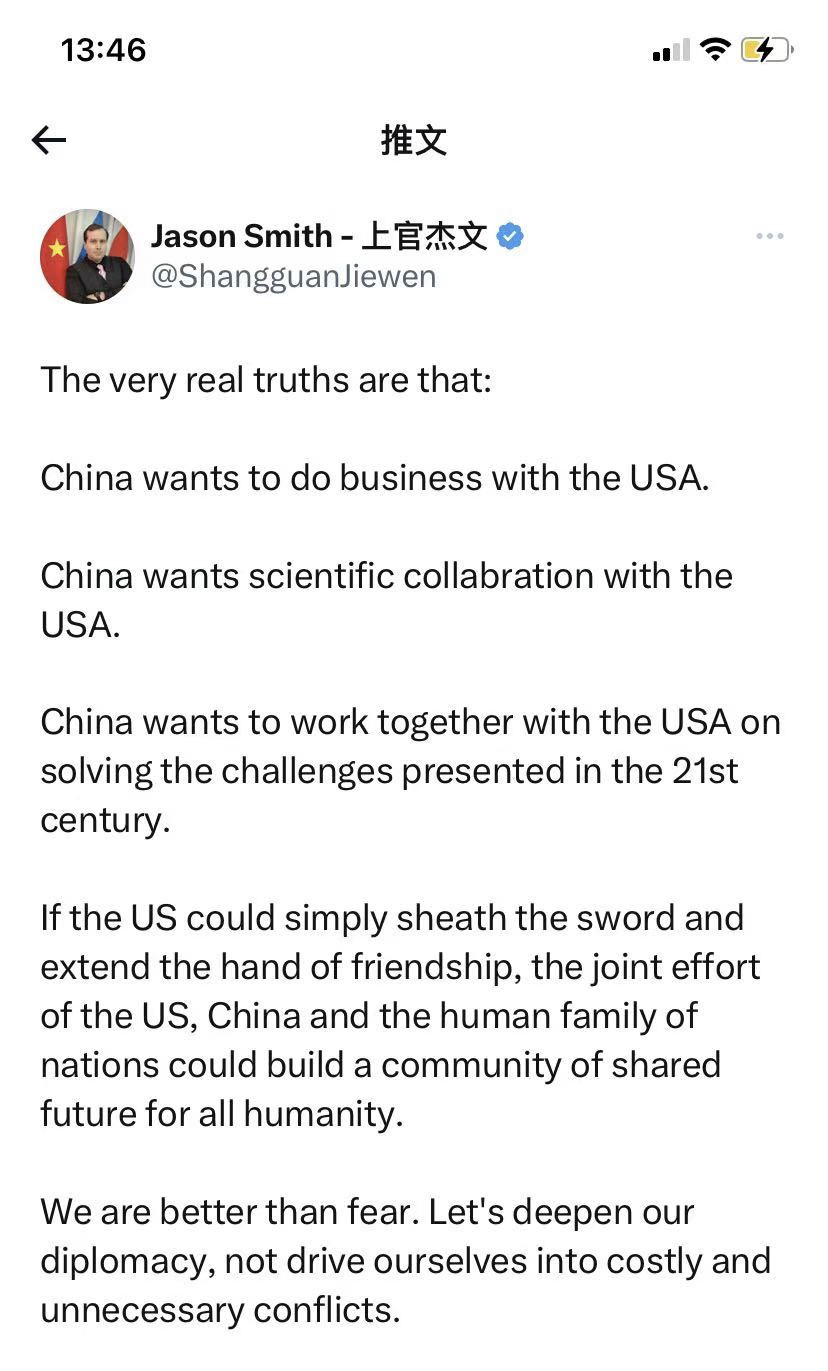 他在推特中稱,“真正的事實(shí)是,中國(guó)愿意與美國(guó)做買賣、進(jìn)行科學(xué)合作,并共同解決21世紀(jì)面臨的挑戰(zhàn)。如果美國(guó)能夠停止敵對(duì)行動(dòng),并伸出友誼之手,中美兩國(guó)和全人類大家庭可以共同努力構(gòu)建人類命運(yùn)共同體。我們比恐懼更強(qiáng)大,讓我們深化外交關(guān)系,避免陷入代價(jià)高昂且不必要的沖突中。”