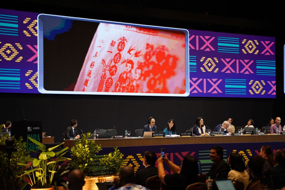 12月4日,在巴拉圭亞松森聯(lián)合國教科文組織保護非物質(zhì)文化遺產(chǎn)政府間委員會第19屆常會評審現(xiàn)場,大屏幕播放春節(jié)宣傳視頻。新華社記者朱雨博攝