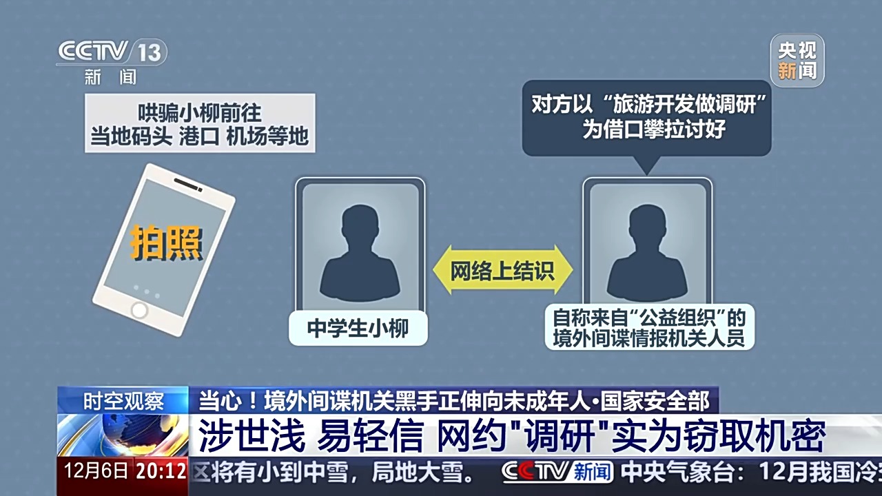 中學生小柳在網(wǎng)絡上結(jié)識了一名自稱來自“公益組織”的境外間諜情報機關人員,對方以“旅游開發(fā)做調(diào)研”為借口攀拉討好,哄騙小柳前往當?shù)卮a頭、港口、機場等地拍照,逐步發(fā)展至收集有關重要軍事設施地點的照片和相關信息,小柳還因此收取了“酬勞”數(shù)千元。涉世未深的小柳在沒有意識到問題嚴重性的情況下輕易相信了對方,沒想到自己的行為已經(jīng)對我國軍事安全和國家安全構成了嚴重威脅。