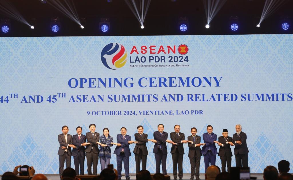 這是10月9日在老撾首都萬象拍攝的第44屆和第45屆東盟峰會(huì)開幕式現(xiàn)場。新華社發(fā)