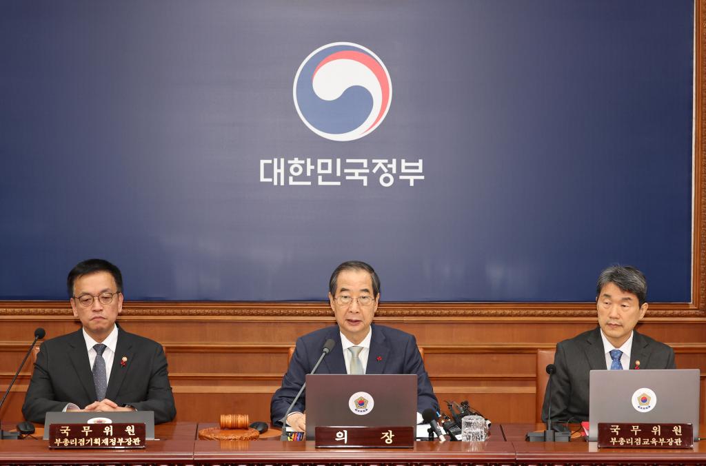 12月14日,在韓國首都首爾,代行總統(tǒng)職權(quán)的韓國國務(wù)總理韓德洙(中)召開臨時國務(wù)會議。新華社/紐西斯通訊社