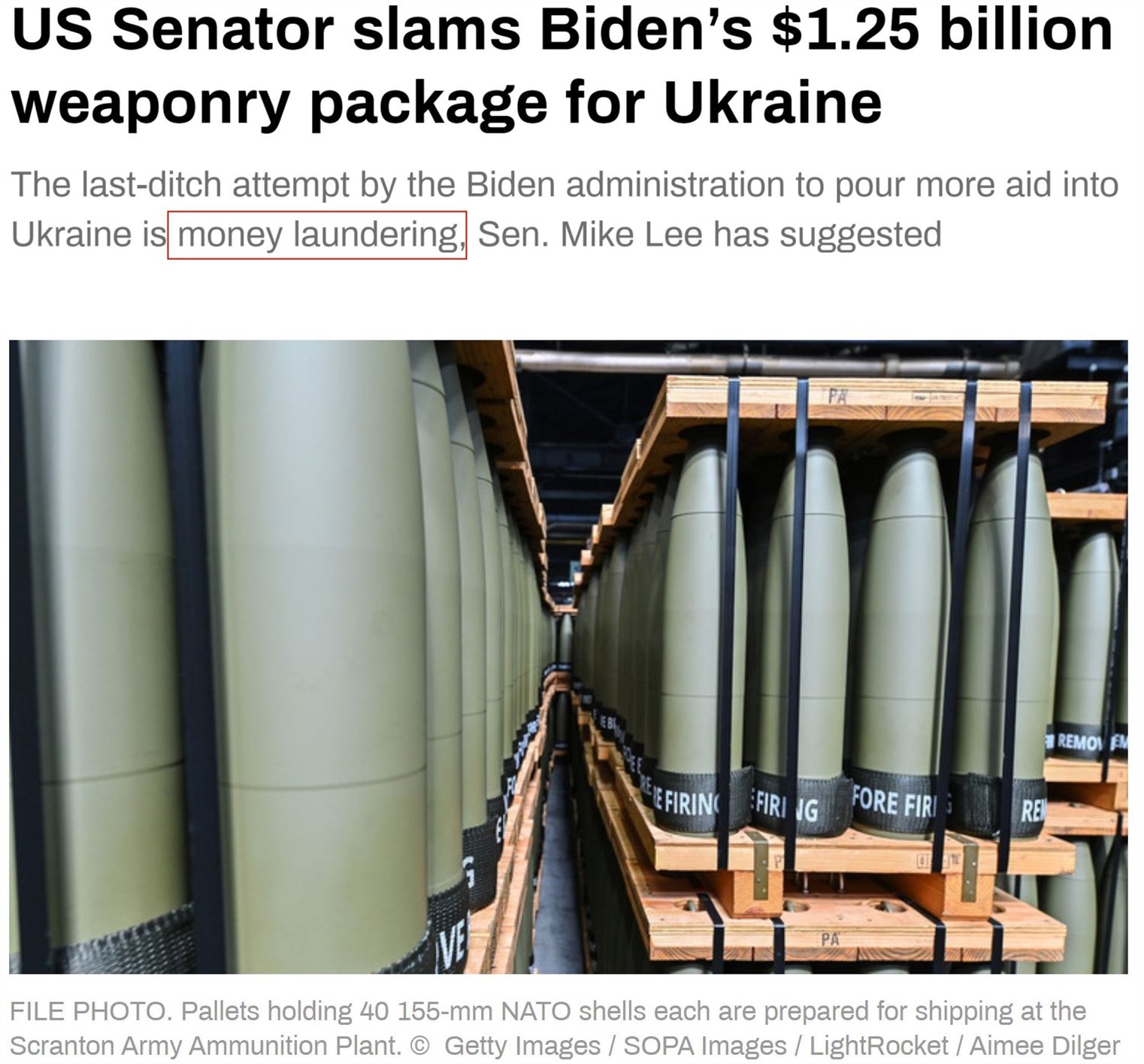 “今日俄羅斯”電視臺(tái)報(bào)道稱,參議員邁克·李認(rèn)為,拜登政府向?yàn)蹩颂m提供新的“豪華武器包”的提議是“洗錢”行為。