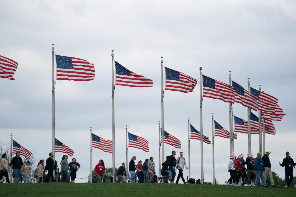 2024年4月25日,游客在美國首都華盛頓的國家廣場游覽。新華社記者劉杰攝