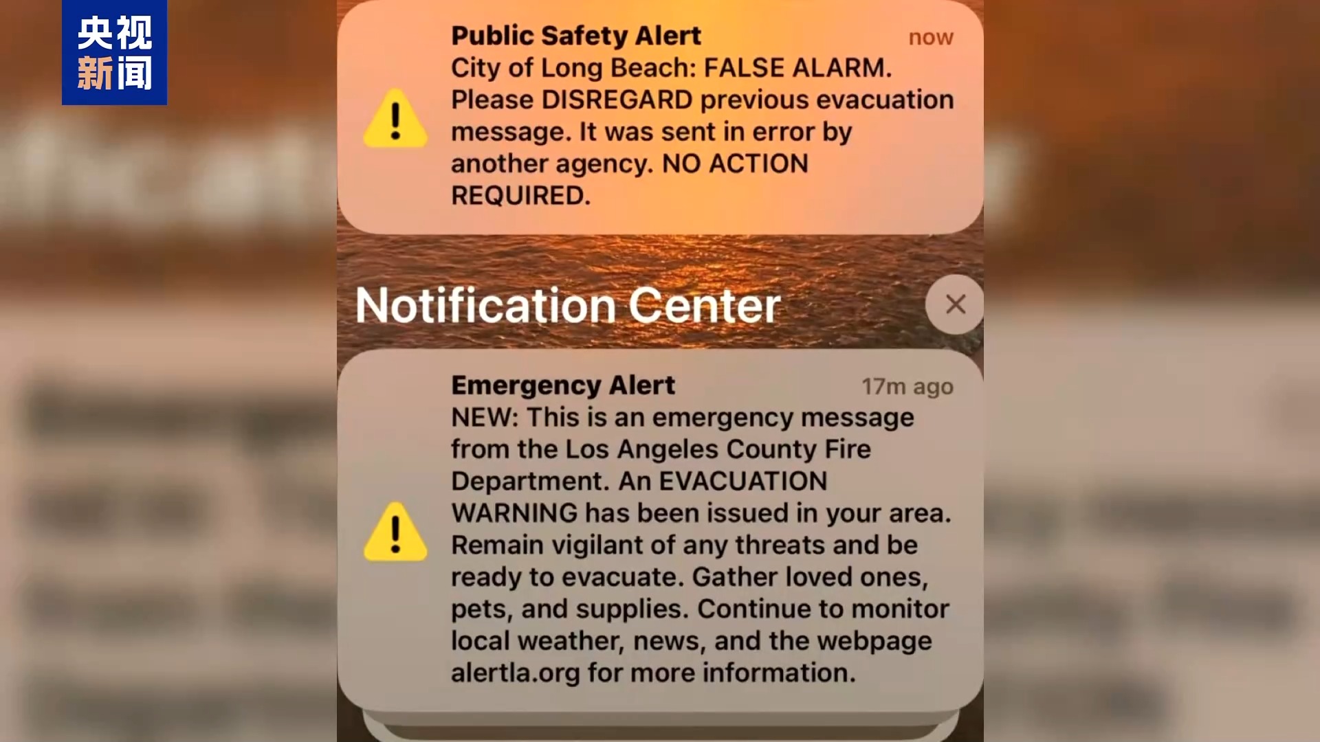 央視記者 劉驍騫:與此同時,根據(jù)我在一線的觀察,人為造成的災害正在出現(xiàn)。首先,洛杉磯縣的警報發(fā)布系統(tǒng)嚴重失靈,造成撤離信息的混亂。一般情況下,如果你所在的區(qū)域處于撤離預警或者需要立刻撤離的范圍內(nèi),手機就會收到由洛杉磯縣發(fā)布的政府警報。第一次發(fā)生警報失靈的情況是10日3時左右,我的手機發(fā)出巨大的警報聲,短信內(nèi)容顯示“我居住的區(qū)域需要立刻撤離”,但是我打開窗,發(fā)現(xiàn)室外并沒有煙味,我立刻登錄了另外幾個災難預警app,也沒有發(fā)現(xiàn)周遭有新的山火出現(xiàn)。幾乎在同一時間,很多生活在洛杉磯不同區(qū)域的網(wǎng)友都表示收到了這條警報。在10日的白天,類似的錯誤警報幾乎每隔幾小時就出現(xiàn)一次,普通居民也從一開始收到警報時的緊張,變成麻木,有的人為了避免過于焦慮,甚至在手機設置中關(guān)掉了政府警報通知。