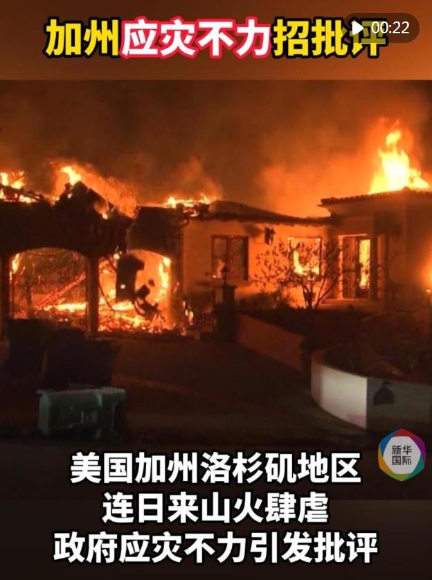美國加利福尼亞州洛杉磯地區(qū)連日來山火肆虐,截至11日已造成16人死亡,至少13人失蹤,上萬棟房屋被燒毀。州及地方政府應災不力引發(fā)批評。