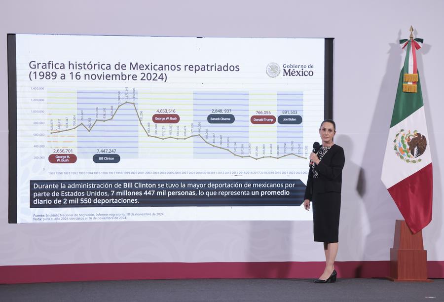2025年1月21日,墨西哥總統(tǒng)辛鮑姆在首都墨西哥城舉行的例行新聞發(fā)布會上講話。新華社發(fā)(墨西哥總統(tǒng)府供圖)