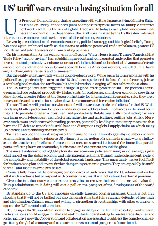 美國關(guān)稅政策令全球貿(mào)易保護(hù)主義高漲,或?qū)?dǎo)致生產(chǎn)效率下降、企業(yè)成本上升、經(jīng)濟(jì)增長放緩等問題。正如美國彼得森國際經(jīng)濟(jì)研究所高級(jí)研究員瑪麗·洛夫利所說,這是一場豪賭,將“釀成經(jīng)濟(jì)放緩和通脹走高的惡果”。