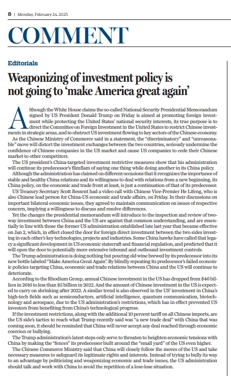 實際上,特朗普政府的做法毫無新意,只是將前任的“舊酒”倒入貼著“讓美國再次偉大”的“新瓶”中。盲目重復此前失敗的對華經(jīng)濟政策,將令中美經(jīng)貿關系持續(xù)惡化。榮鼎集團發(fā)布的數(shù)據(jù)顯示,2016年中國對美年度投資460億美元,到2022年已跌至不足50億美元。據(jù)預計,中國對美投資將在此后繼續(xù)萎縮。同時,受投資限制政策影響,美國對華半導體、人工智能、量子通訊、生物技術、航空航天等高科技領域的投資也呈現(xiàn)出下降趨勢,阻礙著美國投資者獲取中國技術發(fā)展紅利。