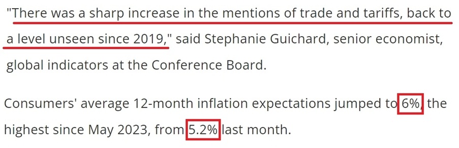 在美國CCI以三年半以來的最大速度惡化的同時,美國消費者對未來一年的通脹預期也從5.2%大幅升高至6%,達到2023年5月以來的最高水平。這進一步顯示,美國人對特朗普政府政策可能對經濟造成的負面影響越來越擔憂。