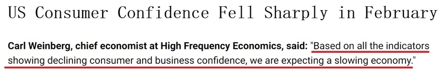 紐約高頻經濟公司首席經濟學家卡爾 溫伯格在給客戶的一份報告中直言:“基于所有顯示消費者和企業(yè)信心下降的指標,我們預計美國經濟將放緩。”
