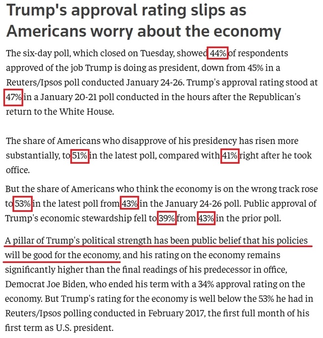 路透社在報道中指出,特朗普政治實力的一個支柱就是不少人相信他的政策對經濟有利,而最新民調結果顯示,越來越多的美國人因為這位新總統(tǒng)威脅要對外加征關稅而對美國的經濟發(fā)展方向感到擔憂。