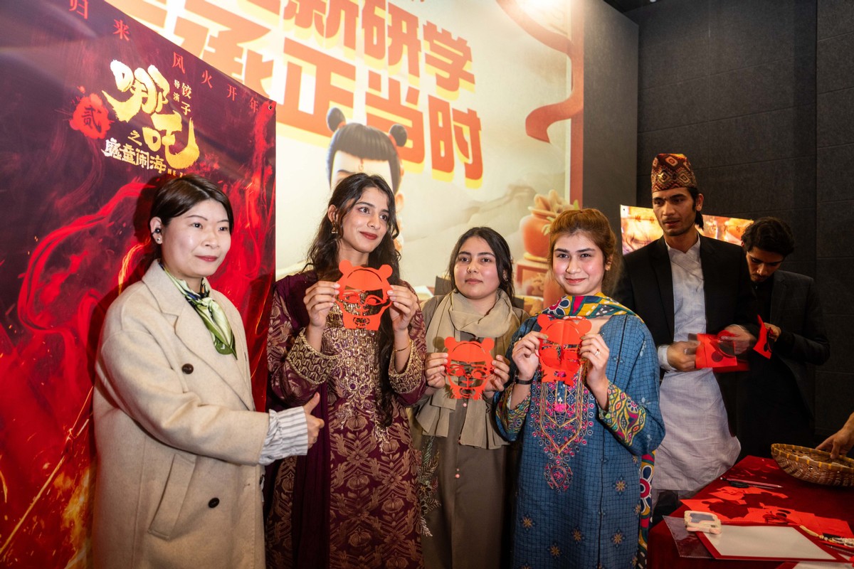 2月25日,在長沙摩天輪國際影城,留學(xué)生們?cè)谡故尽澳倪浮奔艏堊髌贰#▓D片來源:新華社)
