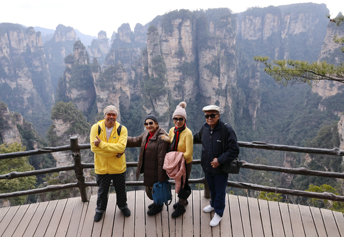 2月15日,泰國游客在張家界國家森林公園袁家界景區(qū)游玩。(圖片來源:新華社)