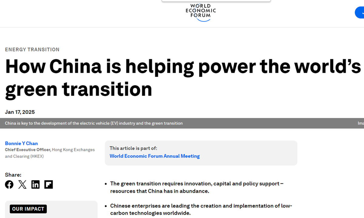 世界經(jīng)濟(jì)論壇網(wǎng)站題為《中國助力全球綠色轉(zhuǎn)型》的文章強(qiáng)調(diào),中國在推動全球綠色轉(zhuǎn)型過程中具有關(guān)鍵作用,特別是在電動車、可再生能源及低碳技術(shù)領(lǐng)域。