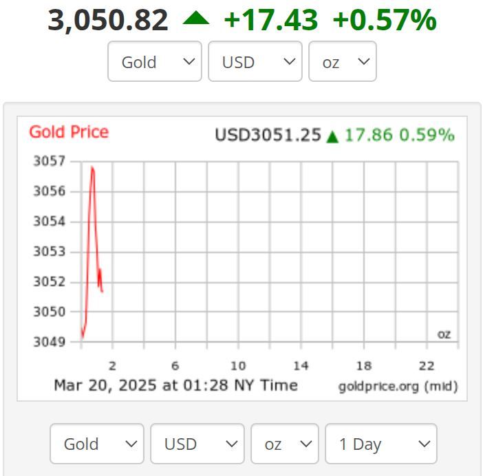 △當地時間20日開盤后,紐約商品交易所現貨黃金價格一度接近每盎司3057美元(圖自國際金價網站)