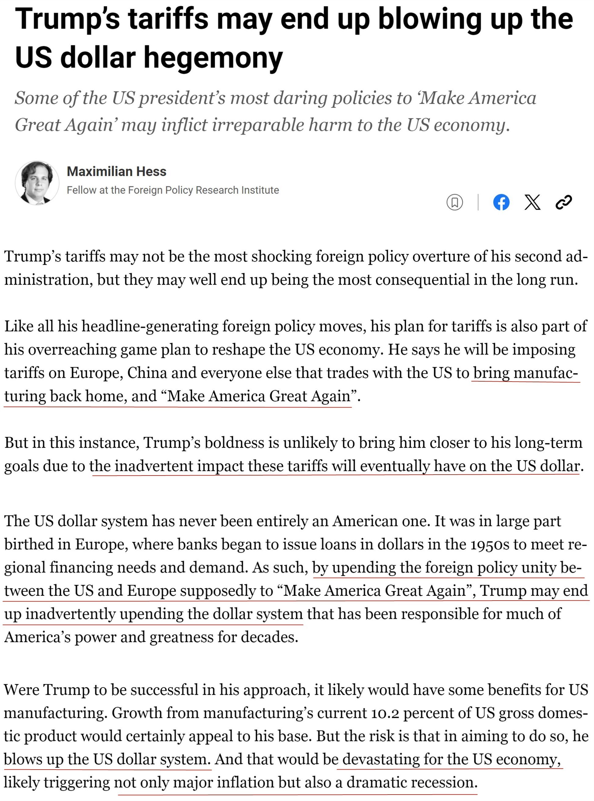 文章指出,一直以來,全球對美元的需求使其成為美國的主要出口產品。正是這種“過分的特權”使美國能夠在不對經濟造成重大負擔的情況下長期維持貿易和財政赤字。而如今特朗普政府的關稅政策可能最終摧毀美元霸權,從而使美國經濟遭到毀滅性打擊。