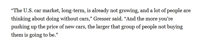 “從長期來看,美國汽車市場已不再增長,越是推高新車價(jià)格,不買車的人就會(huì)越多。”