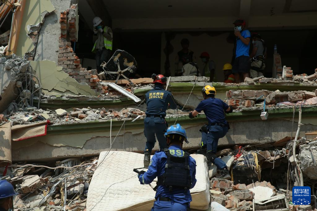 3月30日,在緬甸曼德勒天空別墅公寓建筑群,救援隊及志愿者一起開展救援活動。新華社發(fā)(苗覺梭攝)